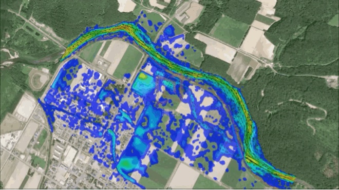 综合运用三维GIS技术和虚拟现实技术,在计算域及周边三维场景基础上,根据水深信息生成水面层,将水的材质、水流速度矢量信息等标量信息映射到水面层上,实现地形地物、景观、洪水演进的动态显示。