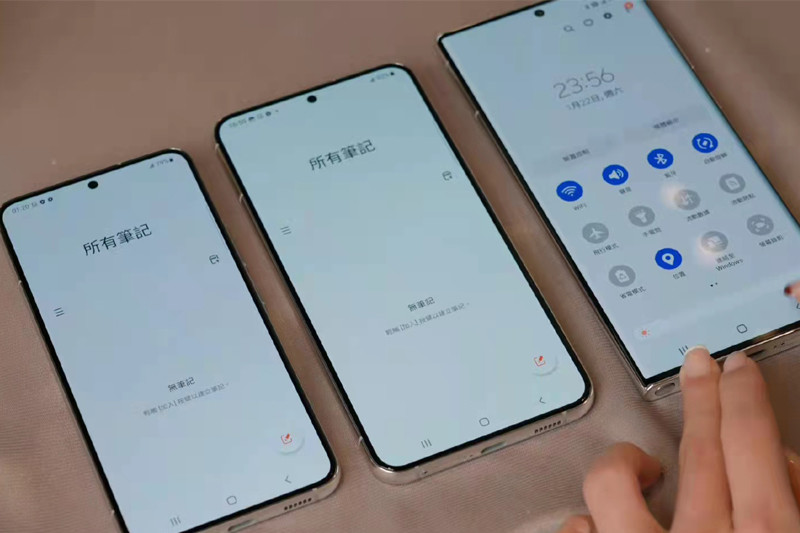 S22系列机身正面都是采用居中打孔屏设计,S22和S22+采用有圆角,S22 Ultra采用正面采用直角设计,更加偏向商务风格。S22机身厚度7.6mm,重168g。S22+机身厚度7.6mm,重196g。S22 Ultra厚度8.9mm,重228g。三款手机都支持IP68防水,超声波指纹解锁,双面大猩猩Vicuts玻璃。