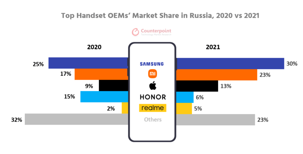 MTS的数据显示,Realme在零售网络的份额从5.7%上涨到12%,荣耀则是从2.5%上涨到5%;由于小米手机在俄罗斯曾出现短缺现象,所以并没有小米的统计数据;不过小宅猜测,如果小米在俄罗斯敞开销售,市场份额大概率也是翻倍上涨。