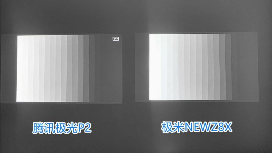 在灰阶对比表现上可以明显看出,极米NEWZ8X与腾讯极光投影P2的16色灰阶区分的都较为清晰,但在前2段白阶的表现中极米NEWZ8X表现较为清亮、边界稍有不清。灰阶测试是由最亮到最暗的16份亮度变化进行对比,其灰阶粗略的地划分成七级。由白、灰白、浅灰、灰、深灰、浅黑、与黑形成的色调变化,在这项测试中可以看出亮度和灰度校正的好与坏,明暗对比黑白颜色,过渡的越自然就是越好的。所以整体看下来腾讯腾讯极光投影P2的灰阶表现是更加自然的,在明暗对比上也更加的分明。