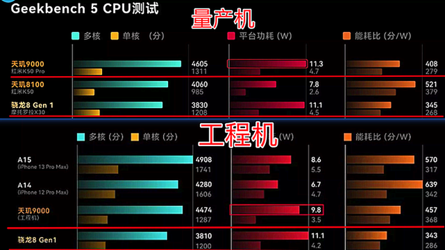 据悉,在量产机上,天玑9000的成绩是单核1311分,多核4635分,单核功耗为4.7W,多核功耗为11.3W。