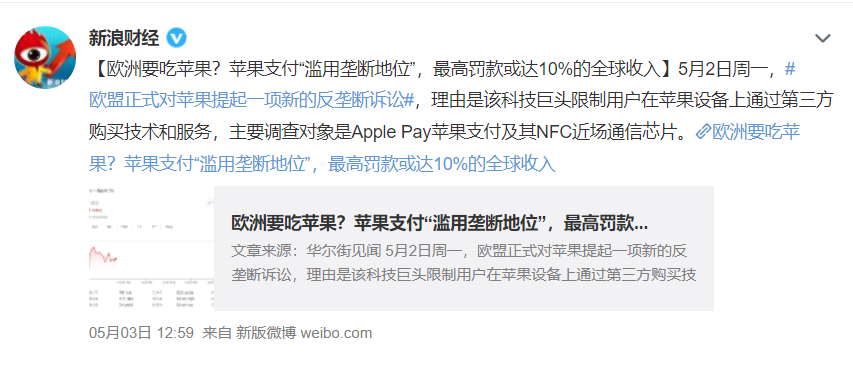 限制用户在苹果设备上通过第三方购买技术和服务,主要调查对象是Apple Pay苹果支付及其NFC近场通信芯片。