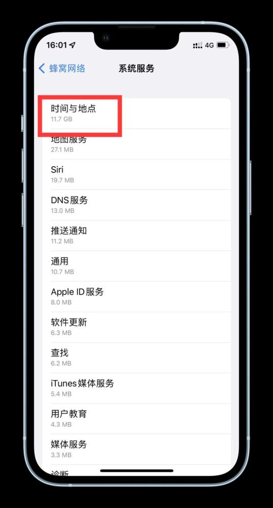 已经升级iOS 15.5正式版的用户可以打开iPhone上的设置-蜂窝网络-系统服务,找到时间与地点,看看当前已经偷跑了多少流量。