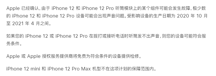 由于iPhone 12和iPhone 12 Pro听筒模块上的某块组件可能会发生故障,导致少数iPhone 12和iPhone 12 Pro设备出现声音问题。