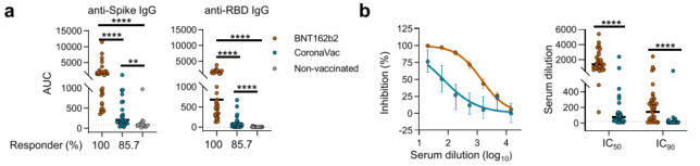 与港大类似,香港中文大学在对两种疫苗的免疫原性进行比较研究后得出以下实验数据。