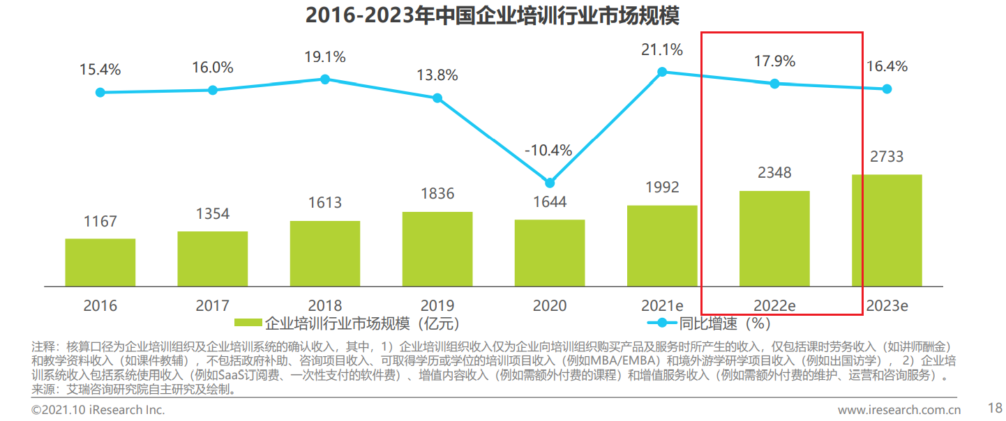 这也助推企业培训行业市场规模不断上涨。据艾瑞咨询2021年报告显示,中国企业培训市场在2022年将继续维持17.9%的增长速度,且行业市场规模将达到2348亿元。